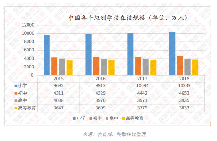根據(jù)教育部統(tǒng)計的數(shù)據(jù),截止2018年底,全國共有各級各類學校51.88萬所;各級各類學歷教育在校生2.76億人。