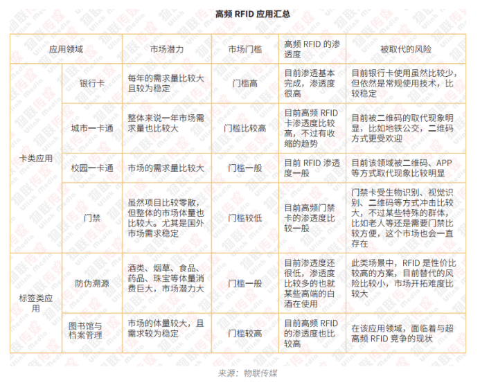 可以將這個市場理解為一個存量市場,雖然在其他技術(shù)的沖擊之下,沒有什么增長點,但經(jīng)過這些年新舊技術(shù)方案的市場磨合,目前還是有很多場景依然在采用RFID技術(shù)方案。而其中值得注意的是,隨著高頻RFID方案成本的降低,在卡類應(yīng)用中,之前很多采用低頻RFID的市場,也在被高頻RFID所取代。