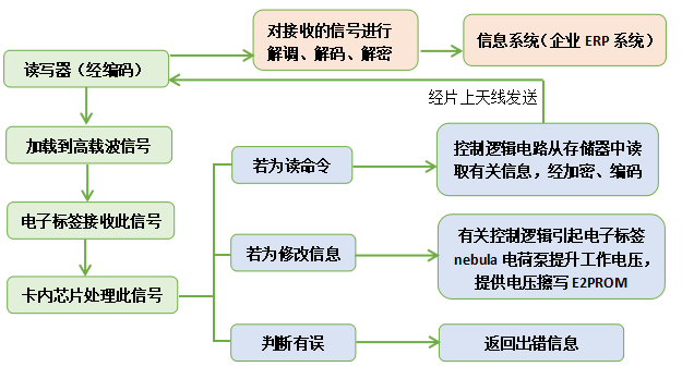 進(jìn)入讀寫器工作區(qū)域的電子標(biāo)簽接收此信號(hào),卡內(nèi)芯片的有關(guān)電路對(duì)此信號(hào)進(jìn)行倍壓整流、調(diào)制、解碼、解密,然后對(duì)命令請(qǐng)求、密碼、權(quán)限等進(jìn)行判斷,電子標(biāo)簽再根據(jù)命令進(jìn)行處理。