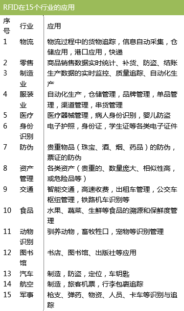 目前,RFID在金融支付、物流、零售、制造業(yè)、醫(yī)療、身份識(shí)別、防偽、資產(chǎn)管理、交通、食品、動(dòng)物識(shí)別、圖書館、汽車、航空、軍事等行業(yè)都已經(jīng)實(shí)現(xiàn)不同程度的商業(yè)化使用。