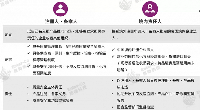 一方面,《化妝品監督管理條例》在原有基礎上確立了化妝品注冊人、備案人制度,規定獲得了特殊化妝品注冊證的注冊人或通過化妝品備案的備案人,需要具備與申請注冊、進行備案的產品相匹配的質量管理體系支持,要對產品全生命周期質量安全和功效宣稱負責,在上市前負責注冊備案管理,在上市后負責不良反應監測、評價及報告、產品風險控制及召回、產品及原料安全性再評估等相關義務,承擔注冊備案產品質量安全的主體責任。